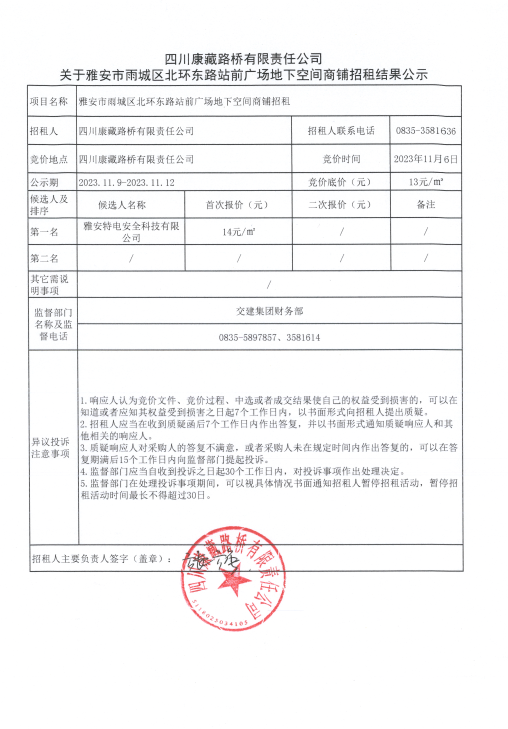 四川康藏路橋有限責任公司關于雅安市雨城區(qū)北環(huán)東路站前廣場地下空間商鋪招租結(jié)果公示