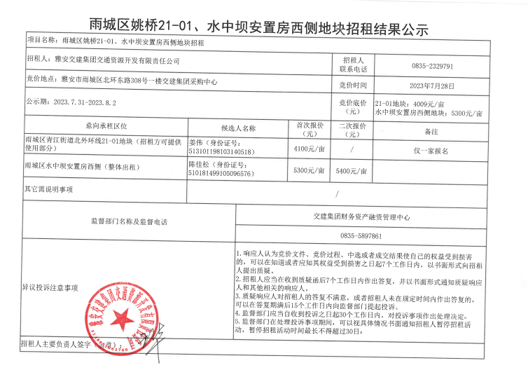 雅安交建集團(tuán)交通資源開(kāi)發(fā)有限責(zé)任公司關(guān)于雅安市雨城區(qū)姚橋21-01和水中壩塊塊招租結(jié)果公示